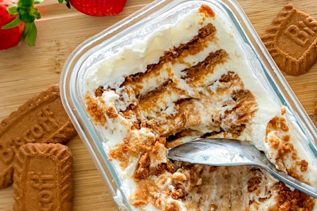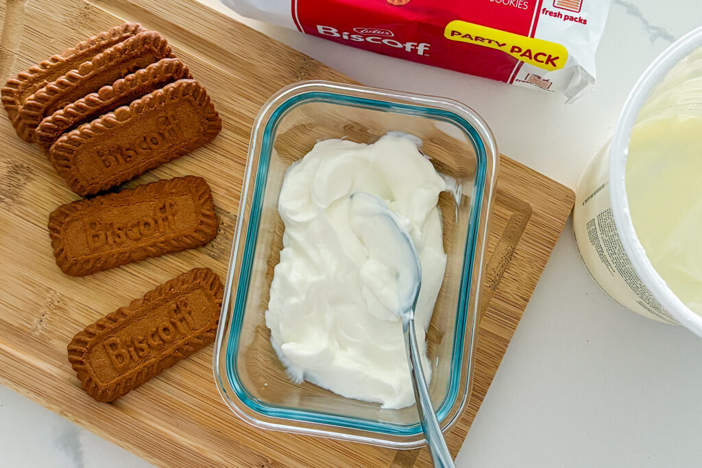 - Spoon the Greek yogurt into a small dish or glass meal prep container. Push the Biscoff cookies vertically into the yogurt, arranging them in neat rows, and press them down so they are fully covered. Add a little more yogurt on top if needed, making sure all the cookies are completely covered.