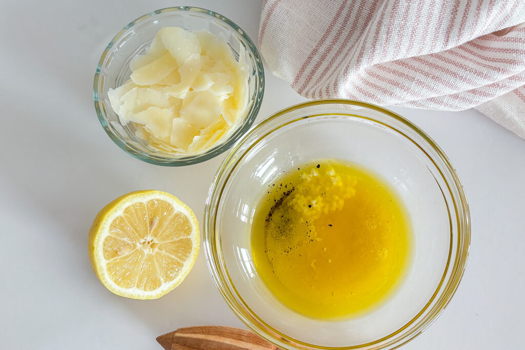 - Combine the freshly squeezed lemon juice, minced garlic, extra virgin olive oil, honey, salt, and pepper in a small bowl. Whisk until smooth and well combined, then taste and adjust the seasoning if needed. Set aside.