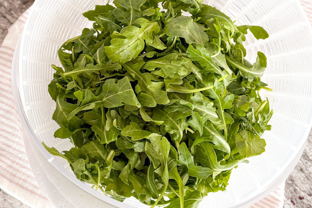 Wash the arugula well: The way arugula grows, it tends to carry dirt and sand. Rinse it under cool water to remove any grit, then dry it thoroughly or use a salad spinner to thoroughly clean. Then spin away the excess water in your salad spinner.
