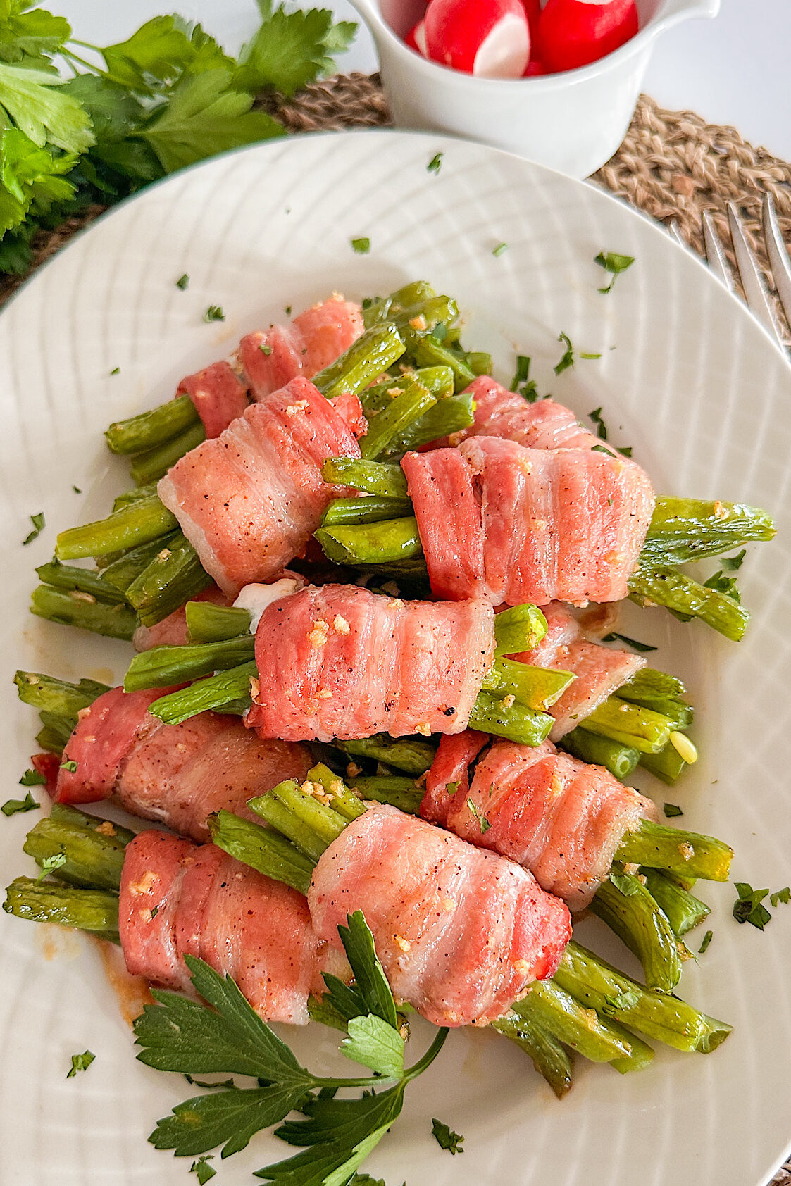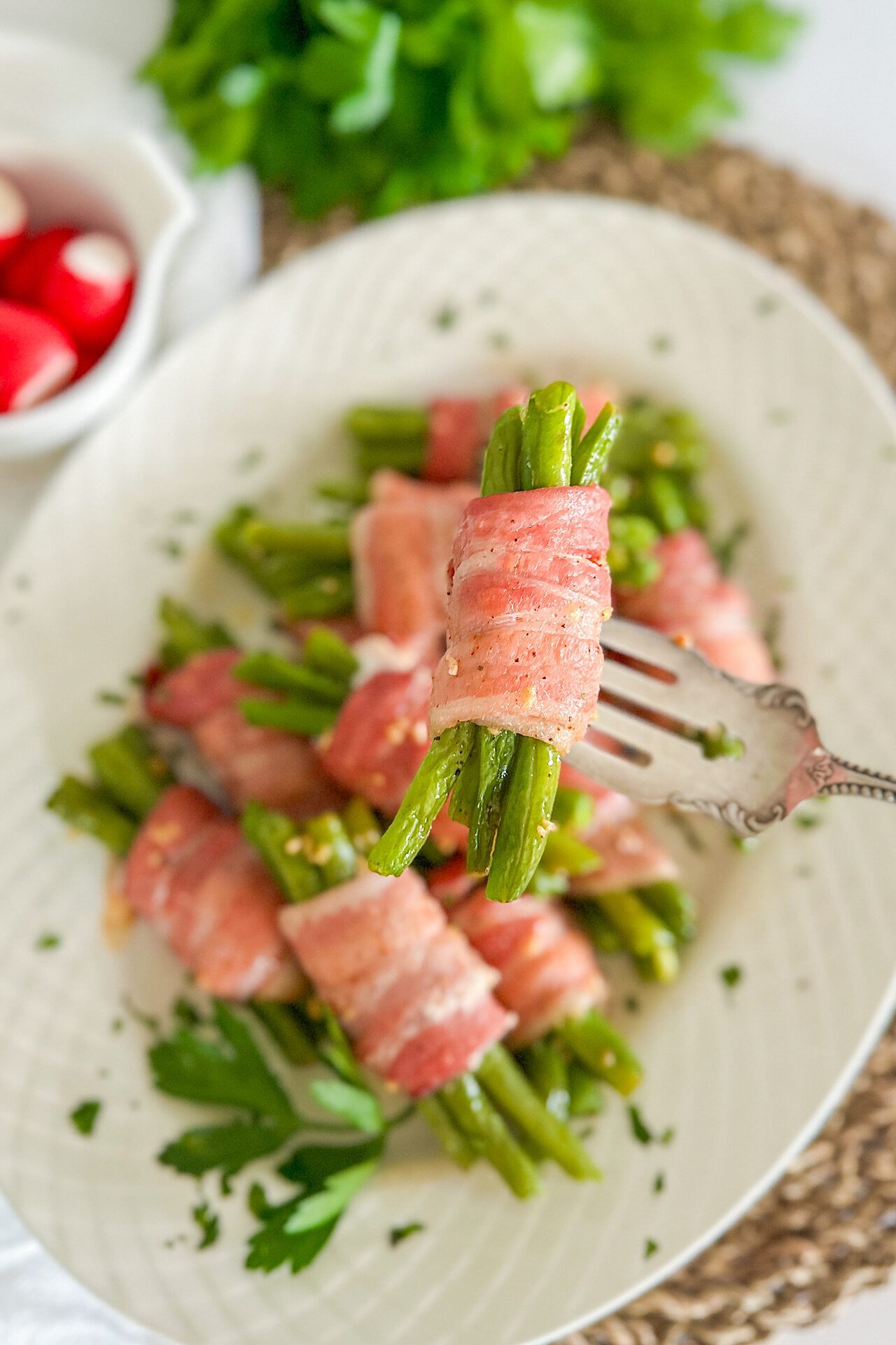 - Wrap one slice of bacon tightly around each bundle, starting at one end and overlapping slightly. Place the seam underneath the bundle.Arrange the bundles seam-side down on the prepared baking sheet. Repeat until all beans and bacon are used.