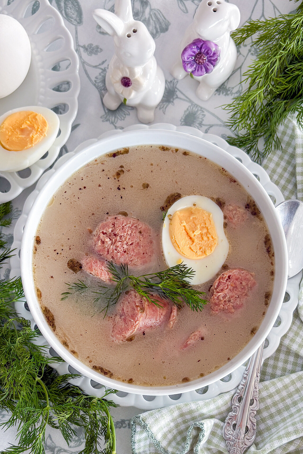 Serve: Ladle the soup into bowls and include pieces of sausage and smoked bacon. Top with halved or quartered hard-boiled eggs and a little horseradish. Garnish with fresh dill and serve with bread on the side.