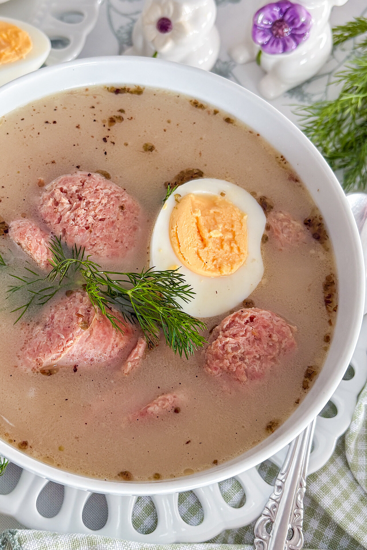 - Serve: When ready to serve, ladle the hot soup into bowls and include pieces of sausage and smoked bacon. Top with hard-boiled egg halves or quarters and a small amount of horseradish to taste (be careful; it is powerful and a little goes a long way). Garnish with fresh dill and serve each bowl with bread on the side to complete this traditional Polish meal.